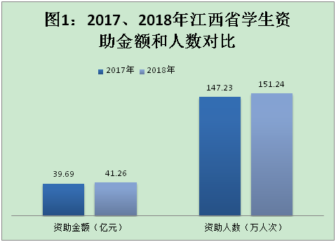 2018年,江西省资助金额和资助人数持续保持增长,共发放资助资金41.26亿元(不含义务365体育网址备用_365彩票娱乐平台_365体育投注注册“两免”,下同),较2017年增加1.57亿元,增幅3.9%;资助各级各类学生151.24万人次,较2017年增加4.01万人次,增幅2.7%。(图1)