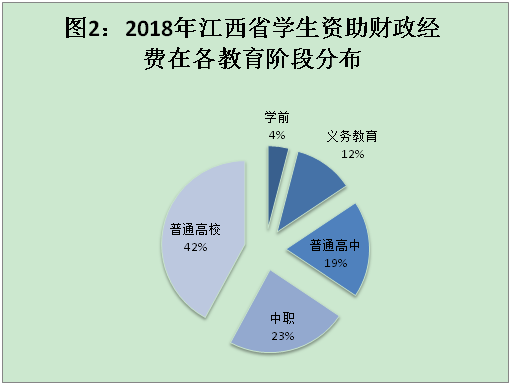 1.财政经费共计30.46亿元。财政投入是我省学生资助经费的主要来源,政府发挥了主导作用。2018年江西省学生资助资金中,财政经费投入共计30.46亿元,占资助资金总额的比例为73.82%,较2017年财政经费增长4.2%。在财政经费中,学前365体育网址备用_365彩票娱乐平台_365体育投注注册资助金财政经费1.23亿元;义务365体育网址备用_365彩票娱乐平台_365体育投注注册资助财政经费3.53亿元;普通高中资助金财政经费5.71亿元;中职365体育网址备用_365彩票娱乐平台_365体育投注注册资助金财政经费7.17亿元;普通高校资助金财政经费12.82亿元(图2)。
