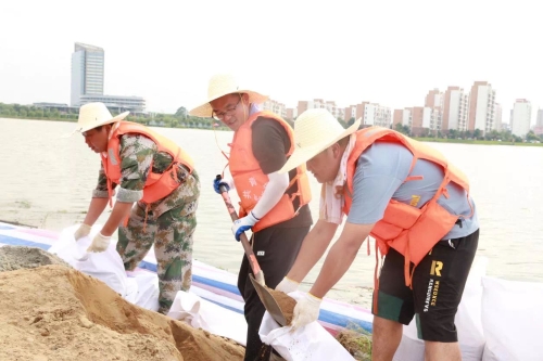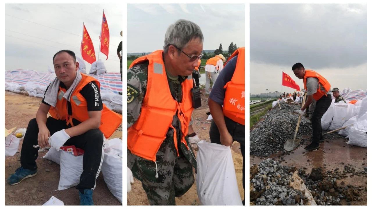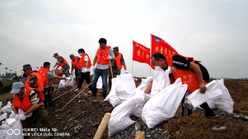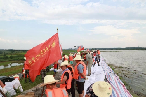 7月11日,南昌大学共青学院党员职工在共青城市政府的号召下积极应战,迅速组成“党员突击队”,高举鲜红的旗帜赶往抗洪一线,构成了靓丽的红色风景线。