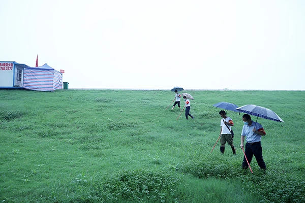 手拿排险棒,挥舞见真功。在堤坝外侧,4名教师一字排开,同步前进,开始拉网式巡查,一边用排险棒拨开草丛,一边仔细查看是否有渗水、鼓泡,用脚感受泥土是否松软。