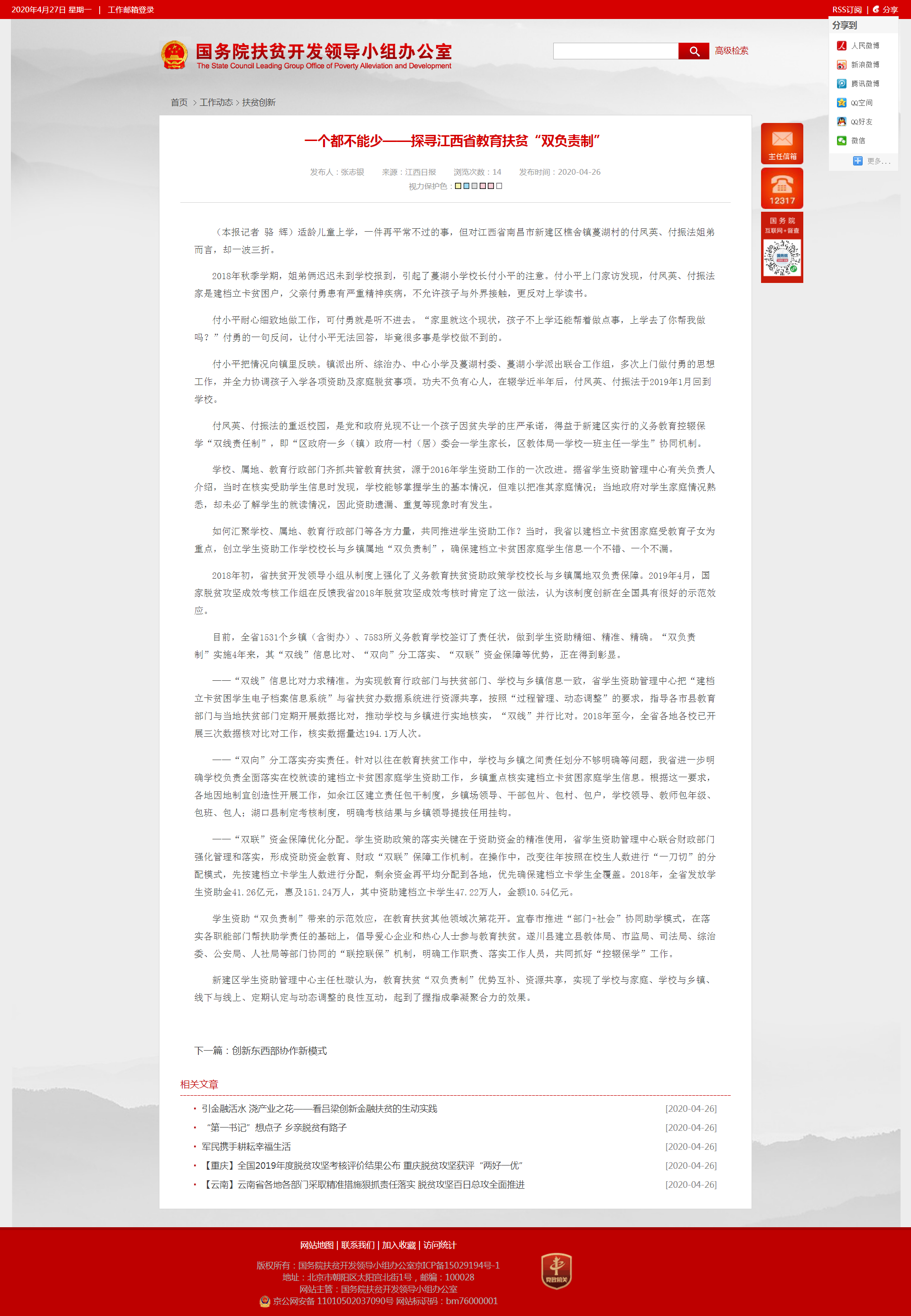 【国务院扶贫开发领导小组办公室官方网站】一个都不能少——探寻江西省365体育网址备用_365彩票娱乐平台_365体育投注注册扶贫“双负责制”