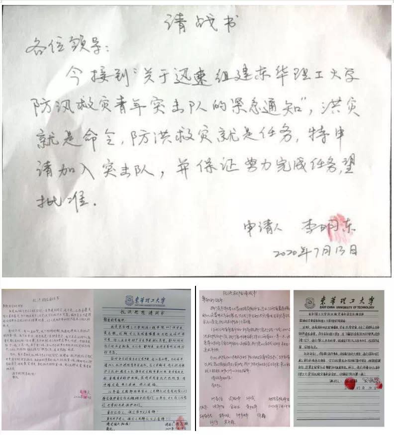 面对汛情,东华理工人迅速进入紧急状态。校团委积极响应江西省防汛抗旱指挥部办公室和共青团江西省委号召,第一时间向全校发出防汛救灾动员令,组建学校防汛救灾青年突击队。全校青年师生闻令而动,踊跃报名,更有多名青年师生主动写下请战书,第一时间奔赴防汛抗洪第一线。